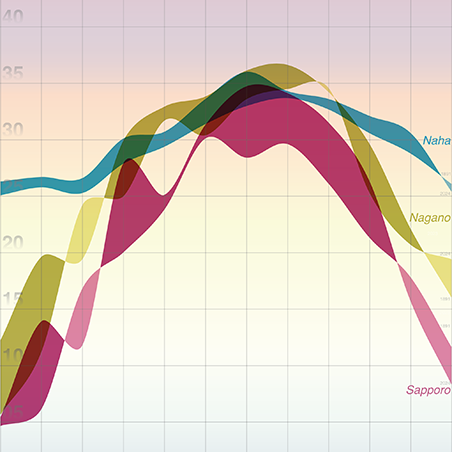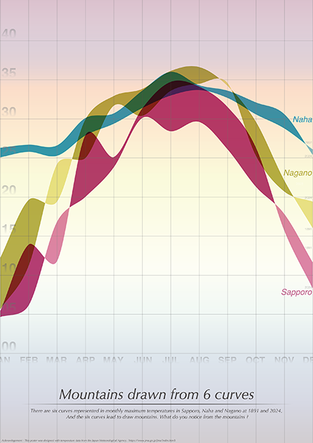 1891年と2023年当時の月毎の最高気温を表し,グラフの平滑化をさせることで滑らかな曲線を描いた.6つの曲線から構成される山々から多くの気づきを得て欲しい.そして1891年から2024年までの自然の変化を確認し,現在の日本の置かれている状況を理解し,我々に何ができるかを考えてアクションしたい.それが「山の幸せ」につながり,「山を愛する人々の幸せ」にも繋がるはずだ. (2025年)
